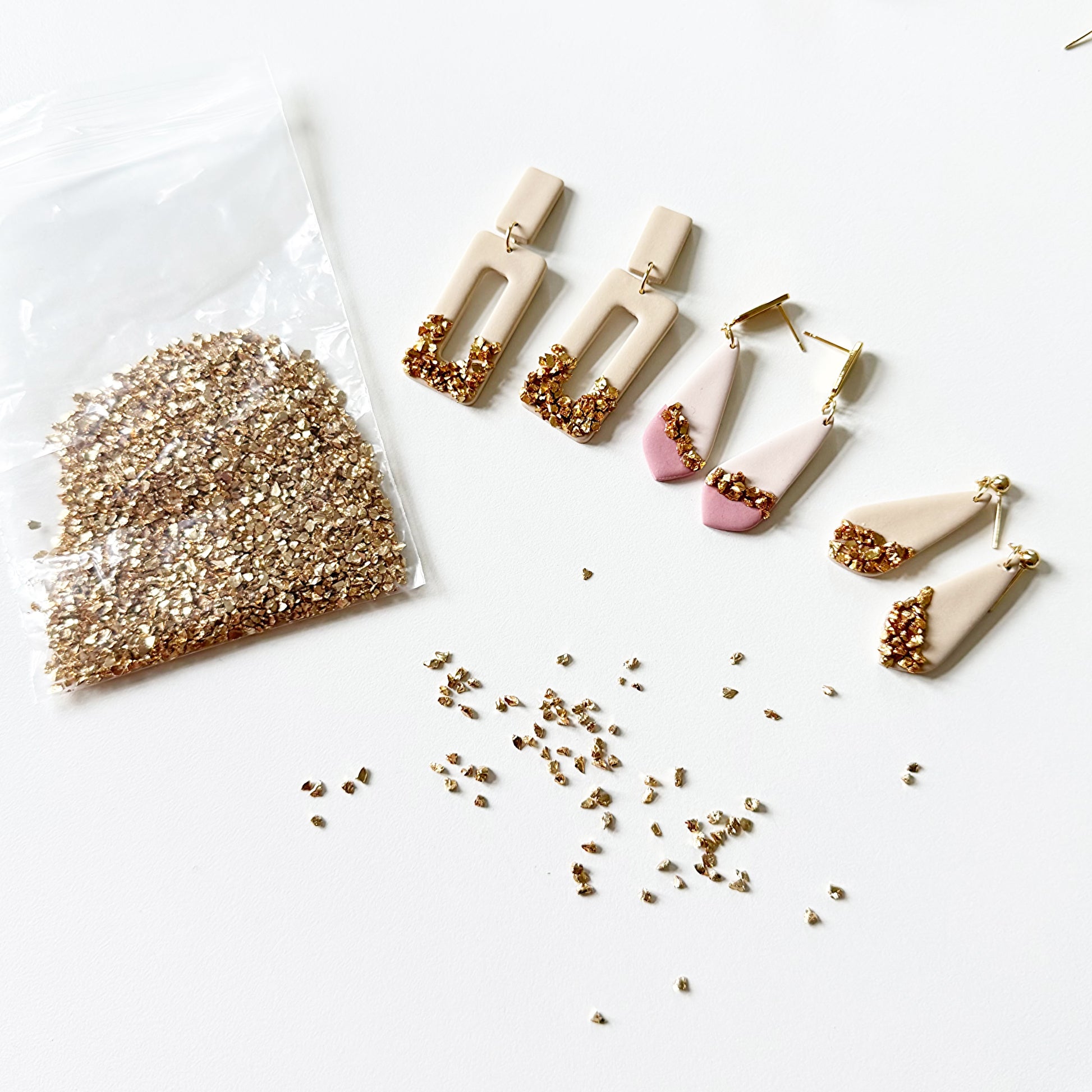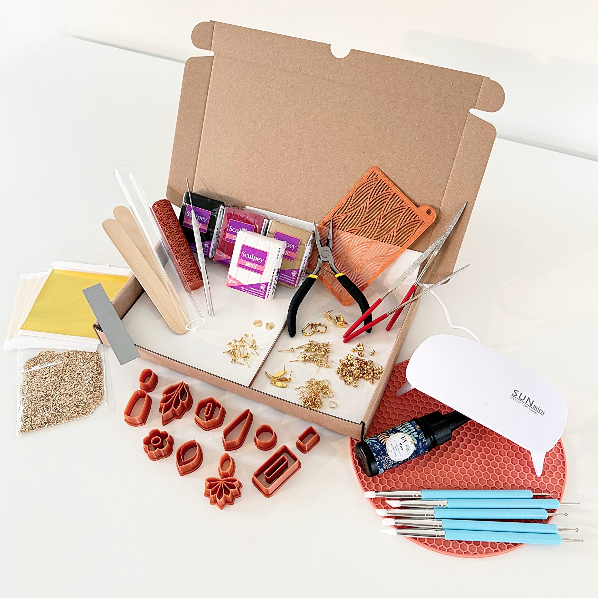 Das Starterpaket ist erhältlich mit gold- oder silberfarbenen Ohrringteilen. Die Tonfarben können gemischt werden, um andere Farben zu erhalten.