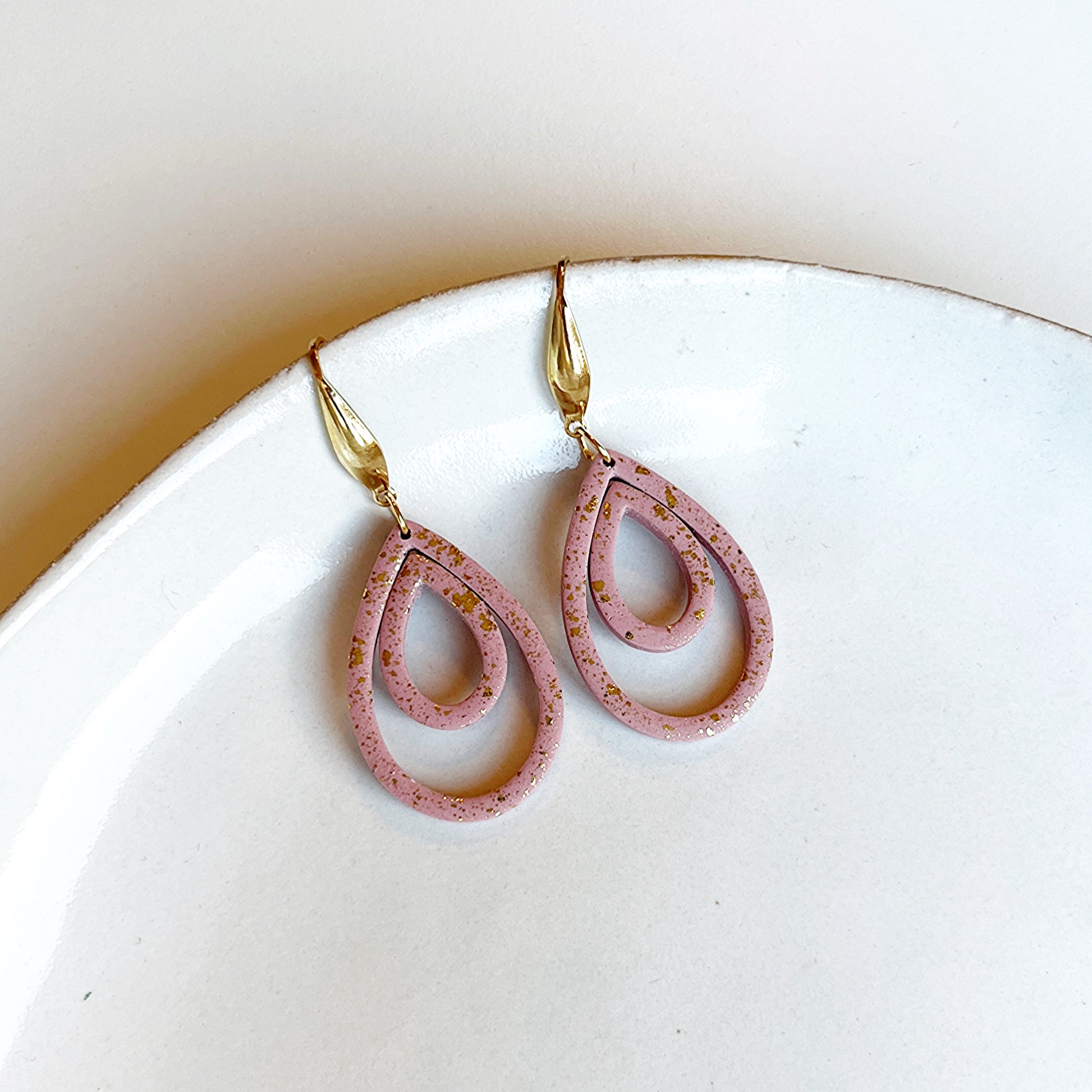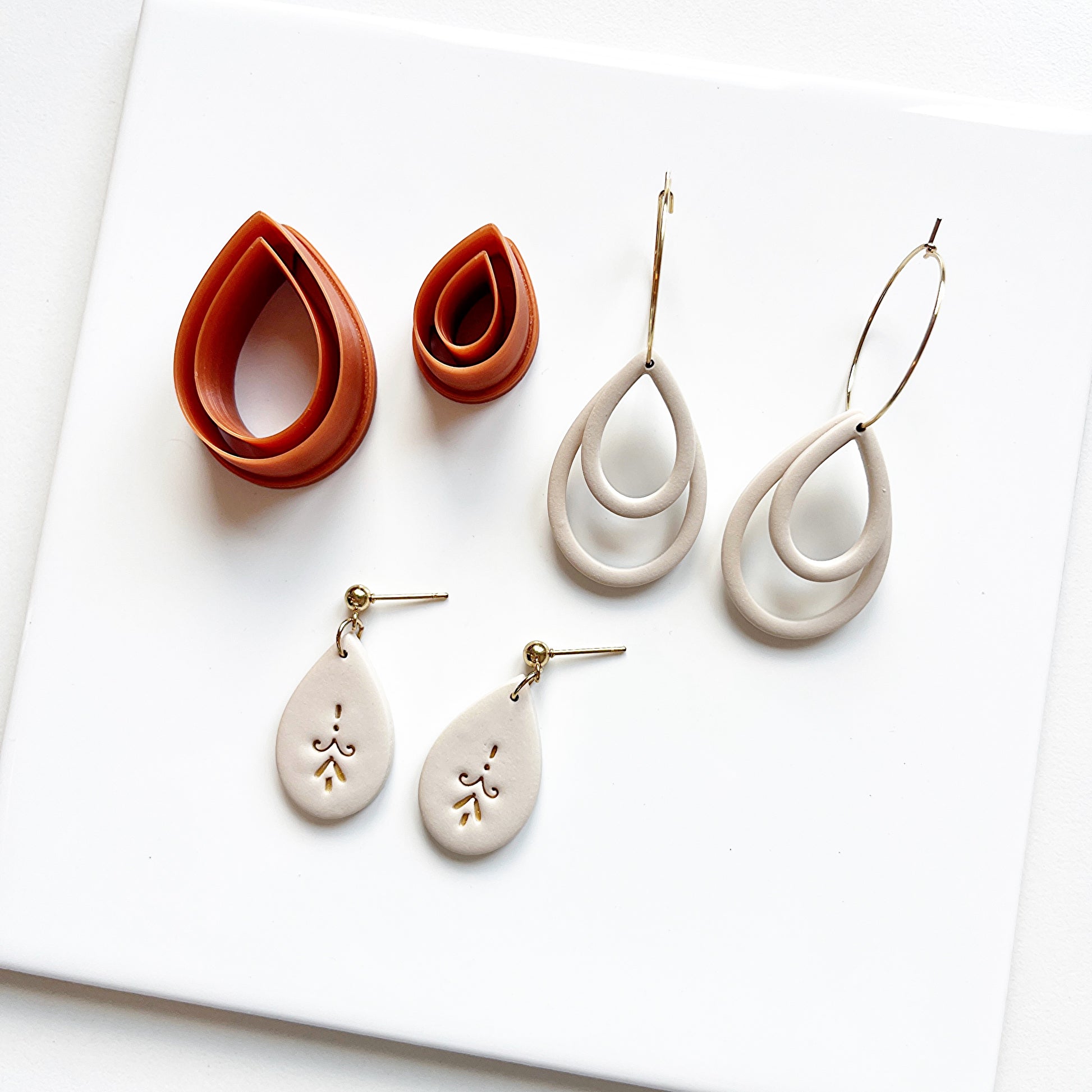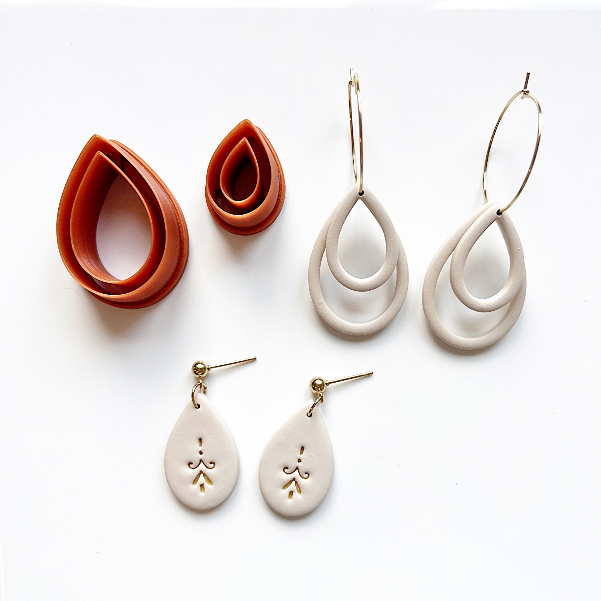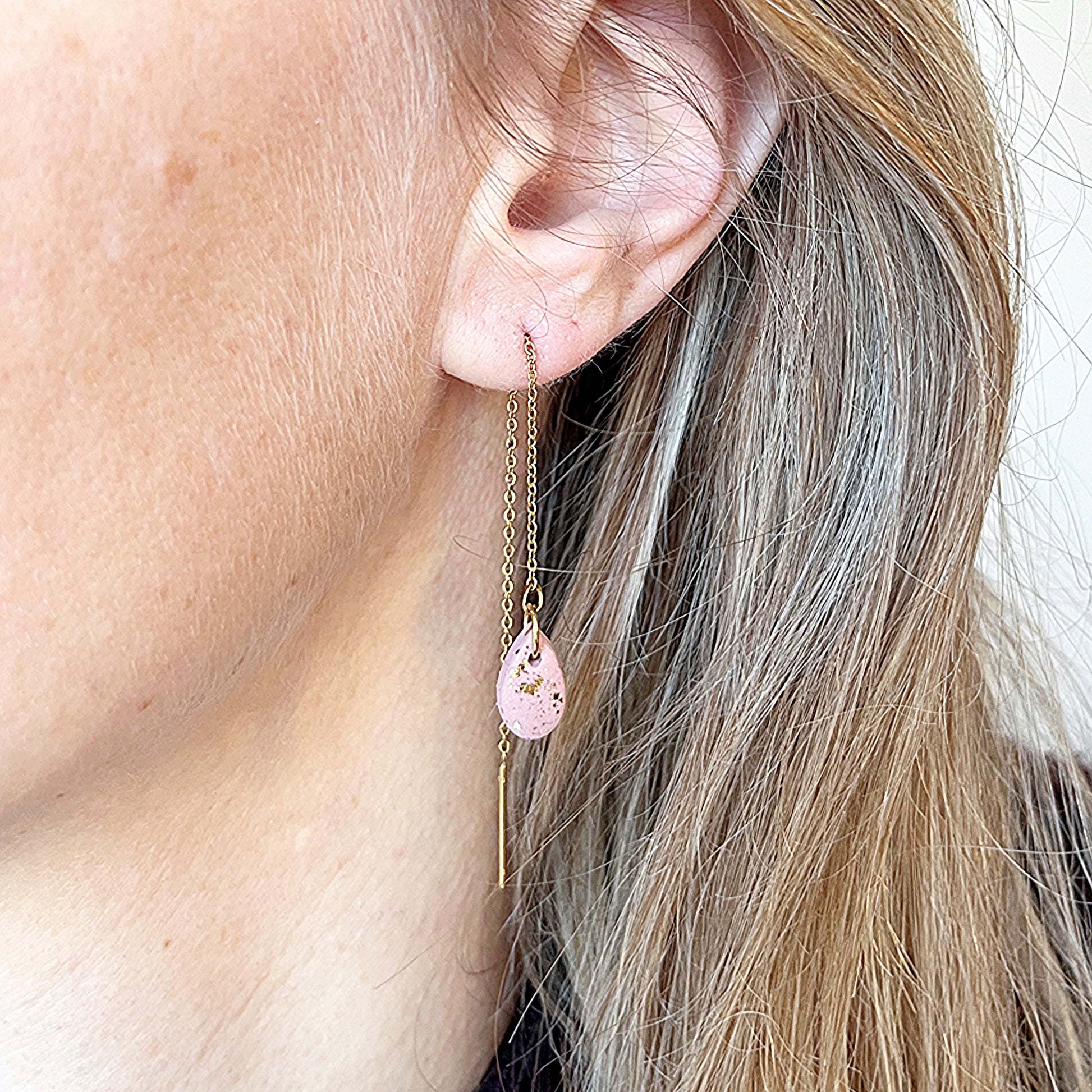 Hang 1 of meerdere formaten rond een jumpring, huggie of oorring voor een speels effect. Je kan beide vormen ook in elkaar bevestigen met behulp van een beetje liquid clay (vb 3e foto).