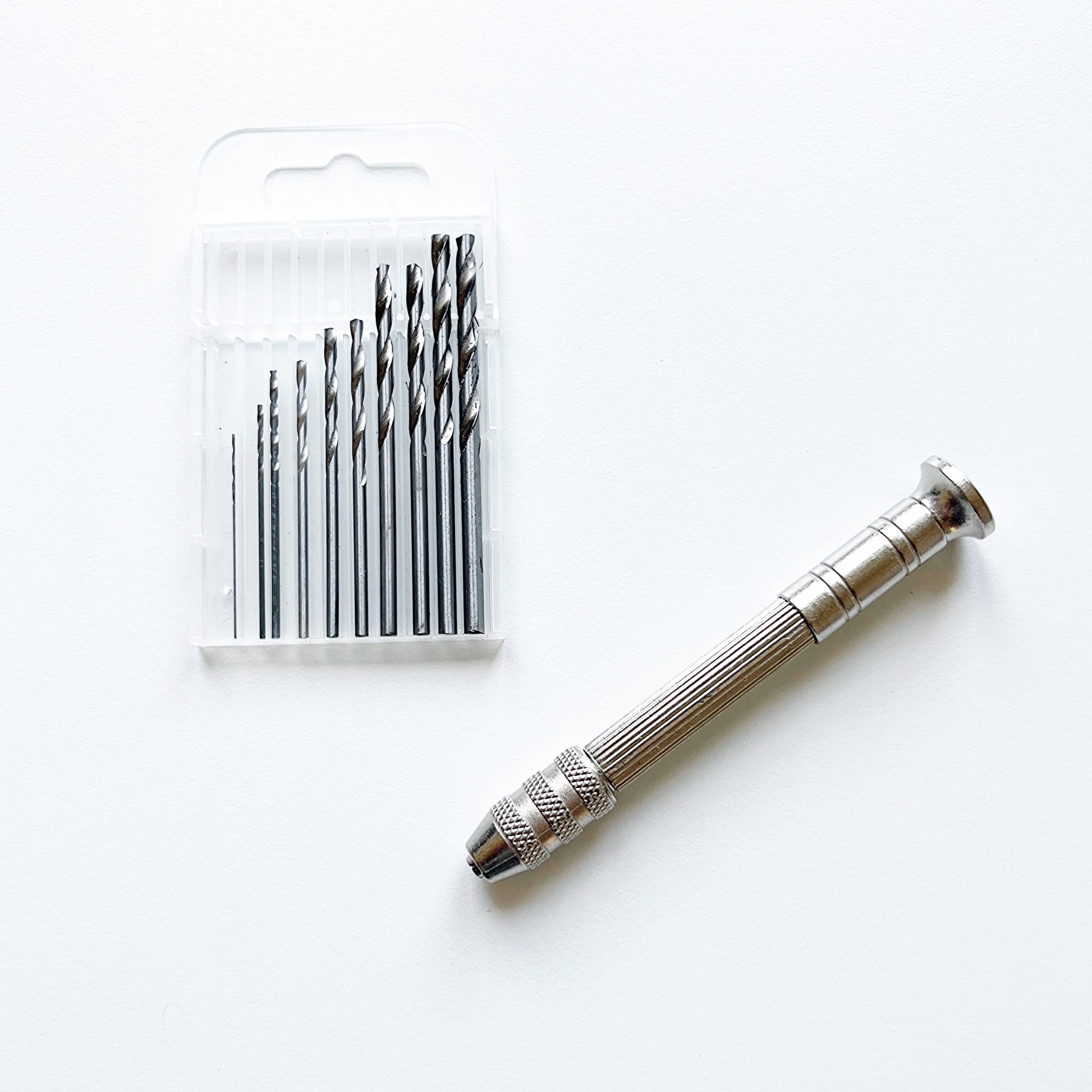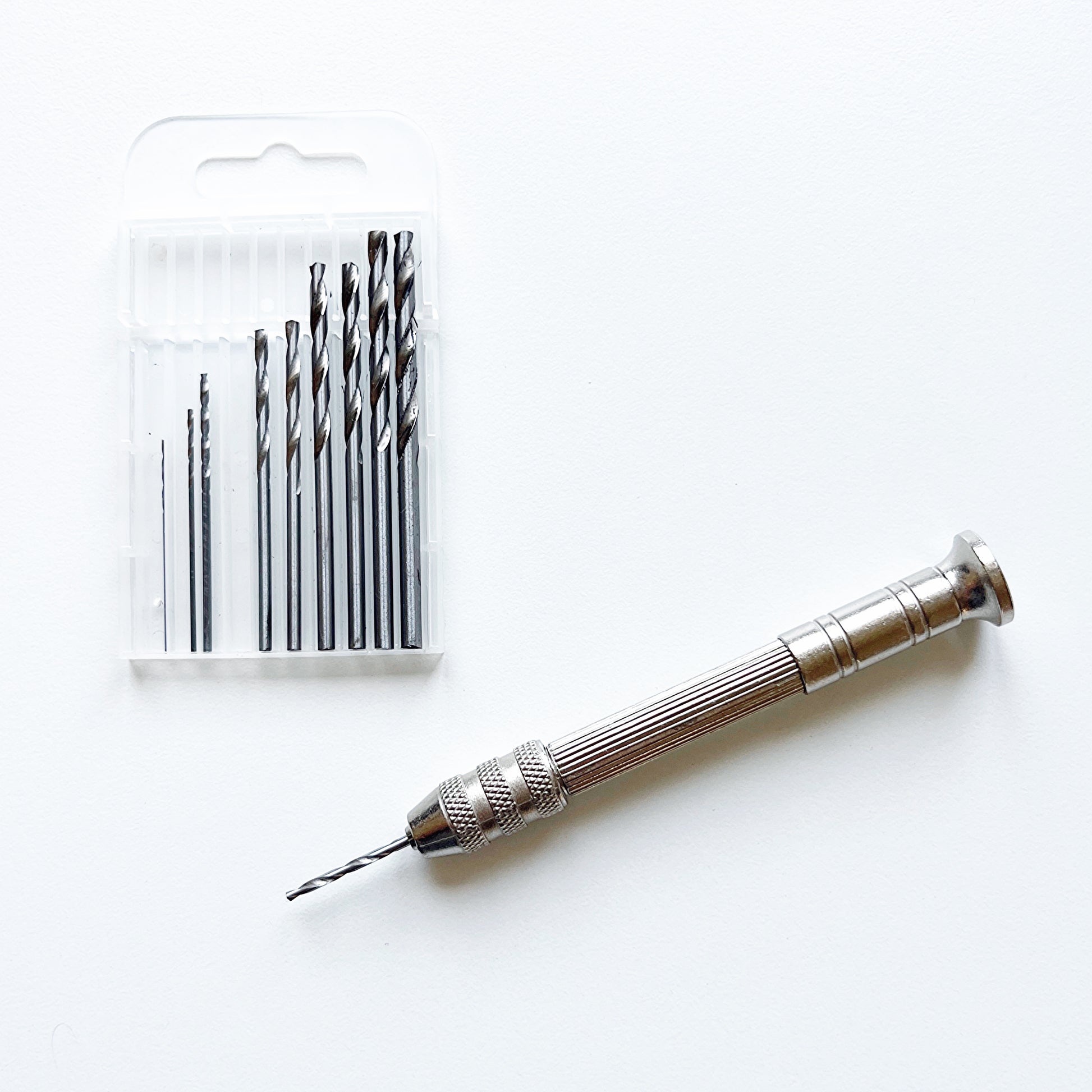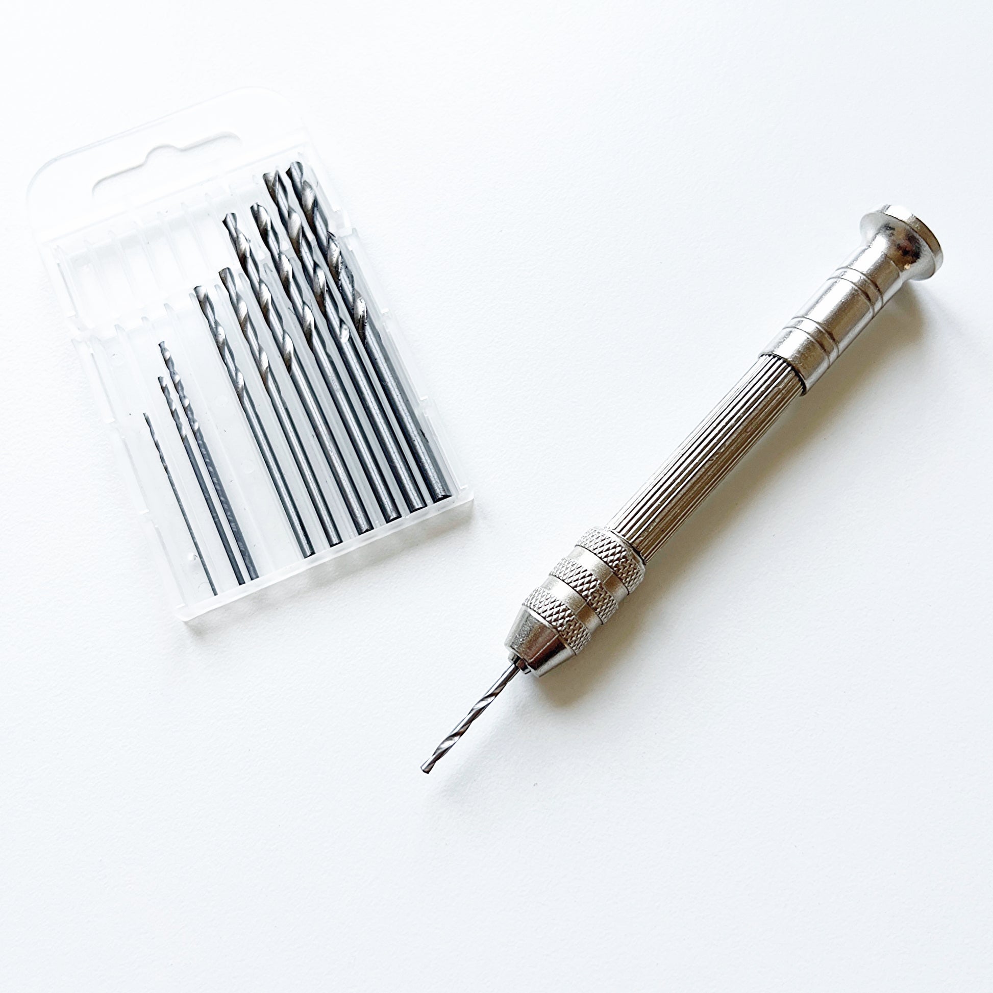 De set bevat 10 fijne boortjes in verschillende maten. Je draait het gewenste boortje gemakkelijk vast in de houder en kunt direct aan de slag. Het handboortje is stevig en licht in gewicht.