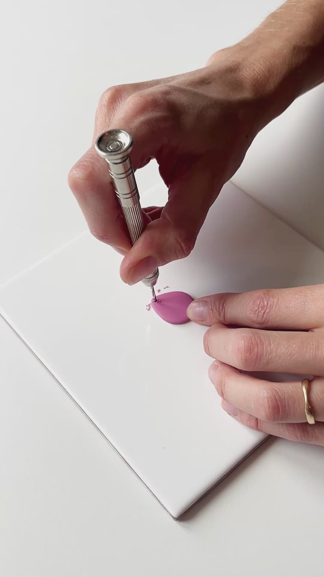 Met dit handige handboortje maak je eenvoudig gaatjes in je polymeerklei-creaties. Gebruik het handboortje altijd ná het bakken van je creatie. Het is slim om vóór het bakken al een klein gaatje te prikken met een needle tool. Zo heb je achteraf een handig verankerpunt om het gaatje groter te maken. Maak een draaiende beweging met het boortje met de klok mee.
