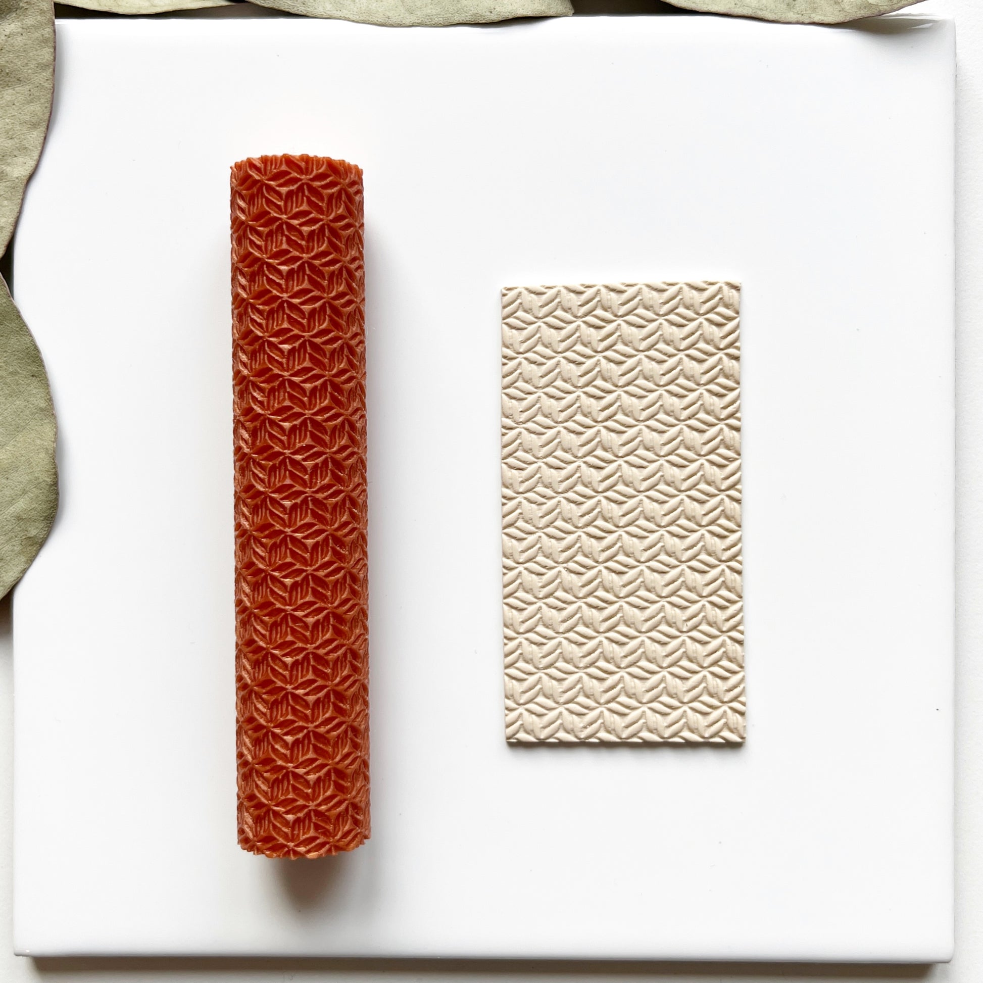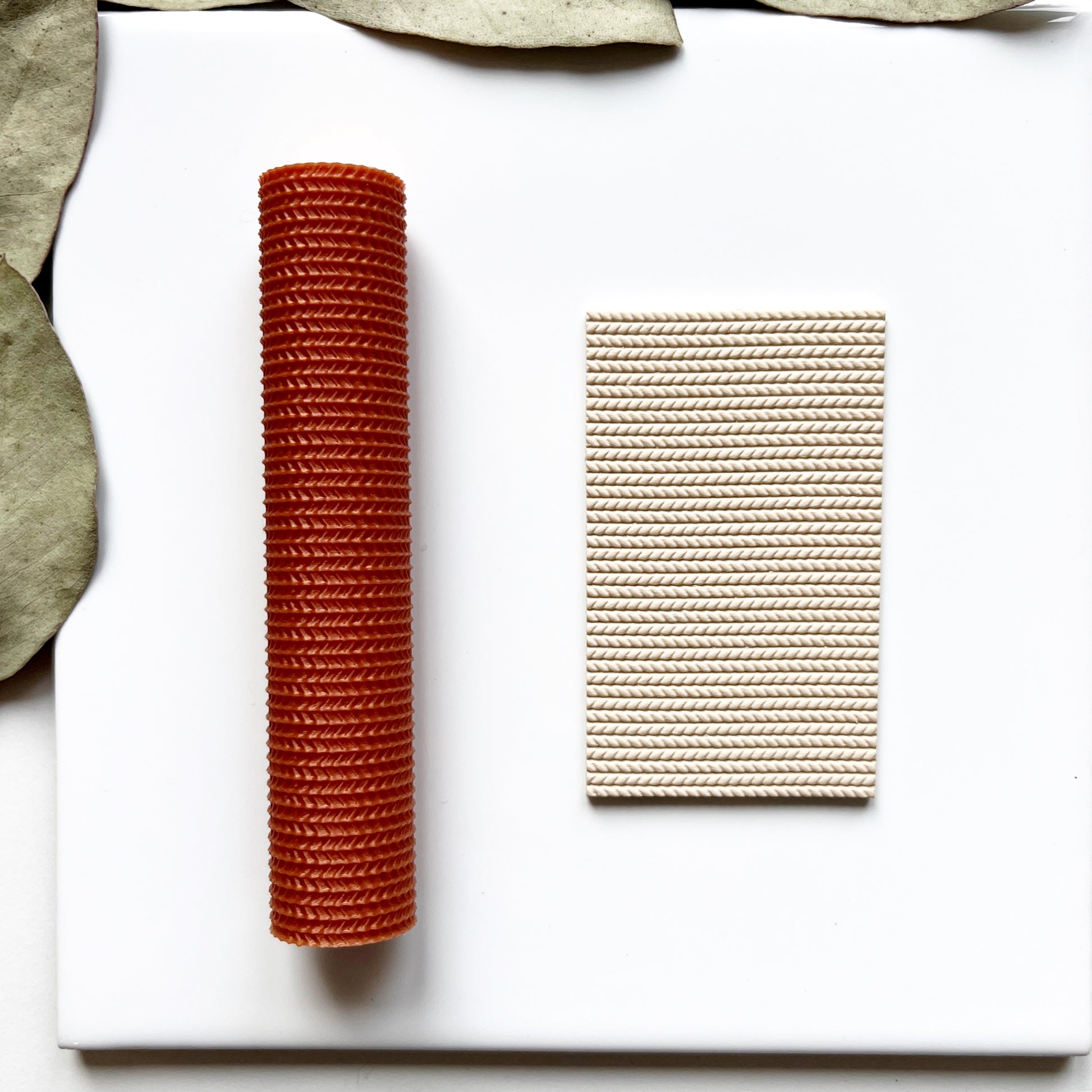 Met een structuurroller geef je een mooie structuur aan je polymeerklei. Het werkt het makkelijkste als je de roller bovenaan de kleislab plaatst en deze in een vloeiende beweging naar beneden rolt. Druk stevig genoeg aan, zodat het patroon goed in de klei gedrukt wordt.